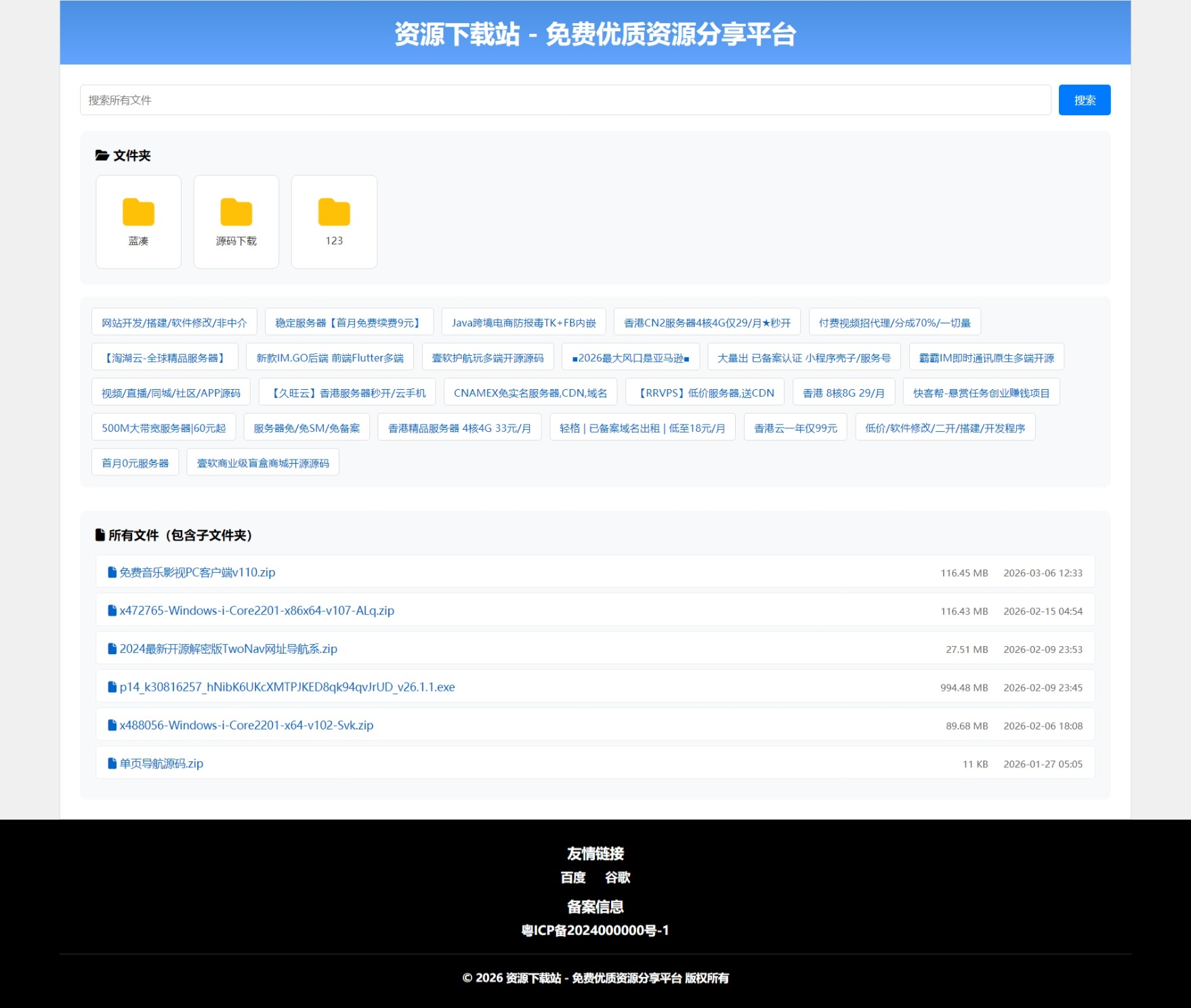 首页顶部设有搜索框,用户可输入关键词(支持文件名模糊匹配),点击搜索按钮或按下回车键,即可快速筛选出符合条件的文件,大幅提升资源查找效率,避免无效浏览。