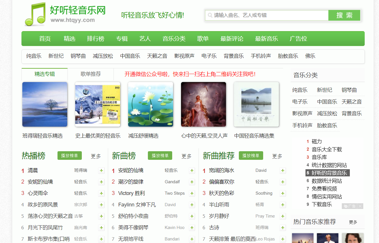好听轻音乐网是中国最好的轻音乐交流平台,专注于分享好听的轻音乐、纯音乐、经典钢琴曲、中国轻音乐、新世纪音乐、背景音乐,是专业的轻音乐在线试听、MP3下载网站。