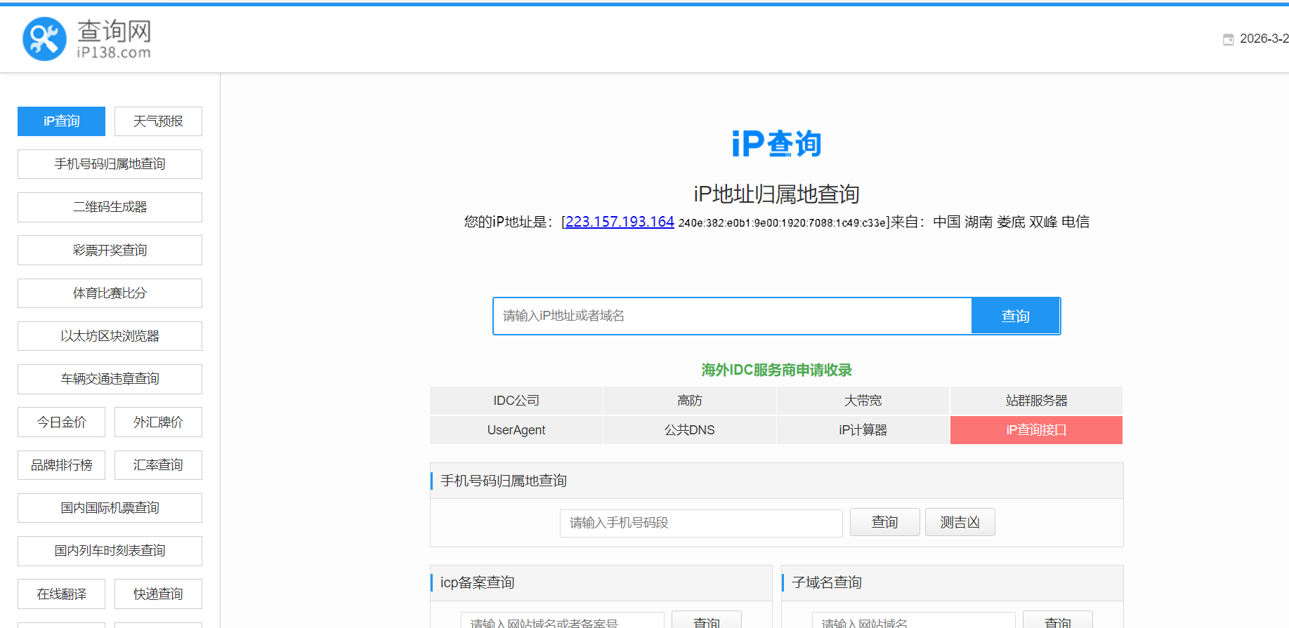 IP归属地查询是一个iP地址查询网站,通过IP查询出具体的归属地、运营商、网络类型等数据,IP属地查询支持ipV4和ipV6各类ip地址查询。 文章版权及转载声明: 作者:admin本文地址:https://dh.2714ai.cn/post/329.html发布于 03-21文章转载或复制请以超链接形式并注明出处2714导航 标签: IP 查询 属地