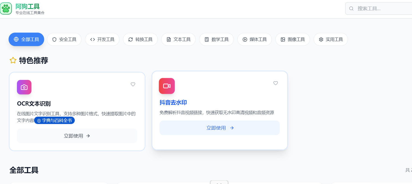 阿狗工具(www.Dog886.Com)是一个在线无需下载即可使用的便捷的在线工具网站,无需登录就可以便捷的使用在线工具的网站。 文章版权及转载声明: 作者:admin本文地址:https://dh.2714ai.cn/post/334.html发布于 03-22文章转载或复制请以超链接形式并注明出处2714导航 标签: 工具 阿狗 在线