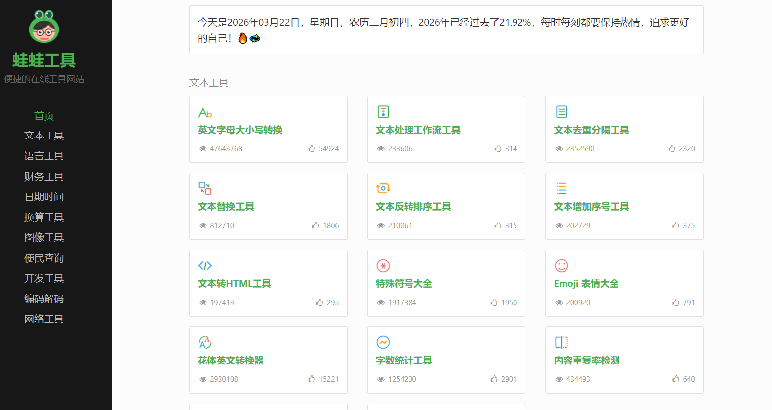 蛙蛙工具是一个免费便捷在线工具网站,提供语言工具、文本工具、转换工具、编码解码、站长工具等便利的在线工具服务,是你生活和工作学习的好帮手。 文章版权及转载声明: 作者:admin本文地址:https://dh.2714ai.cn/post/336.html发布于 03-22文章转载或复制请以超链接形式并注明出处2714导航 标签: 工具 蛙蛙 便捷